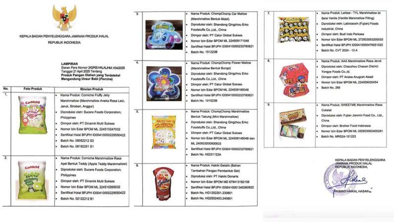 Merujuk Lampiran Siaran Pers Nomor 242/KB.HALAL/HM.1/04/2025 Tanggal 21 April 2025 yang dibagikan melalui laman resmi BPJPH, berikut daftar produk pangan olahan yang mengandung unsur babi (porcine). Tujuh di antaranya telah memiliki sertifikat halal, sementara dua produk memang tidak bersertifikasi halal.